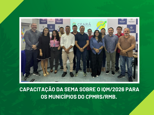 Os municípios integrantes do Consórcio Público de Manejo de Resíduos Sólidos da Região Metropolitana B (CPMRS/RMB) participaram de uma capacitação promovida pela Secretaria do Meio Ambiente (Sema) sobre o Índice de Qualidade do Meio Ambiente (IQM/2026). A atividade foi realizada no auditório da Prefeitura Municipal de Pacajus.